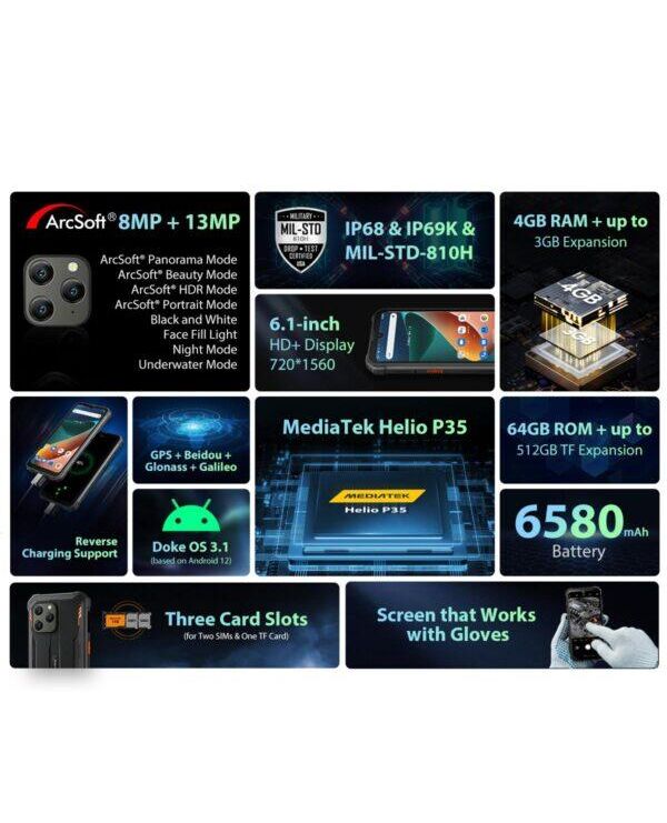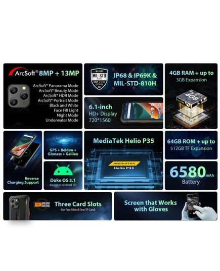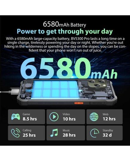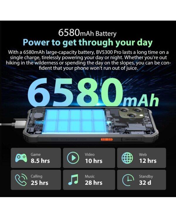 Το BV5300 Pro είναι ένα ανθεκτικό smartphone σχεδιασμένο για ενεργό τρόπο ζωής, με κομψή μαύρη σχεδίαση και στιβαρά χαρακτηριστικά. Ζυγίζει 273 γραμμάρια και προσφέρει απρόσκοπτη συνδεσιμότητα με επιλογές WiFi, Bluetooth, 2G, 3G και 4G. Ισχυρό με λειτουργικό σύστημα Android 12, διαθέτει μπροστινή κάμερα 8MP και οπίσθια κάμερα 13MP με φλας. Η μπαταρία του 6580mAh παρέχει ενέργεια μεγάλης διάρκειας και γρήγορη φόρτιση. Η συσκευή διαθέτει επίσης προηγμένα χαρακτηριστικά όπως GPS, GLONASS, Beidou και Galileo. Υποστηρίζει ασύρματη φόρτιση και OTG. Το BV5300 Pro είναι ένας αξιόπιστος σύντροφος για τους περιπετειώδεις, τους λάτρεις της υπαίθρου και τους επαγγελματίες.Επισκόπηση προϊόντος BV5300 ProΣυνδεσιμότητα: WIFI, Bluetooth, 2G, 3G, 4G, TDD: B40.Λειτουργικό σύστημα: Android 12Χρώματα: ΜαύροΒάρος: 273g.Τύπος οθόνης: ILI9882Q.Ανάλυση οθόνης: HD+ 720*1560 20:9 με αναλογία οθόνης προς σώμα 83%.Γωνία θέασης: Γωνία: Πλήρης γωνία.PPI/DPI: PPI: 283 – DPI: 282.Συχνότητα ανανέωσης: 60HZ.Γυαλί: Γυαλί: Rainbow CG01 Pro+.Υλικό: IMG GE8300@ 660 MHz, 4GB RAM, 64GB ROM, υποδοχή κάρτας TF, USB Type-C.Κάμερα: και οπίσθιο φλας.Ισχύς: Μπαταρία 6580mAh, μέγιστο ρεύμα φόρτισης 5V2A.Πολυμέσα: Βίντεο, ήχος, μορφές εικόνας.Χαρακτηριστικά: GPS, GLONASS, Beidou, Galileo, κινητήρας, αισθητήρες, πυξίδα, δακτυλικό αποτύπωμα, NFC, hotkont, μετρητής σπειρών, ασύρματη φόρτιση, κάρτα sim, FM, OTG, υποδοχή ακουστικών.Αξεσουάρ: Εγχειρίδιο χρήσης, τροφοδοτικό, καλώδιο USB.