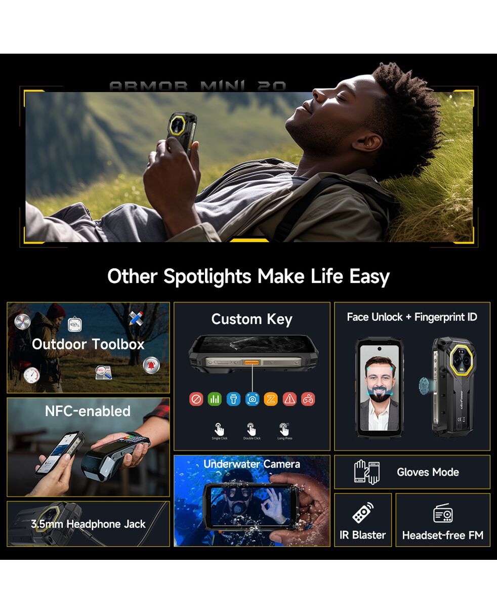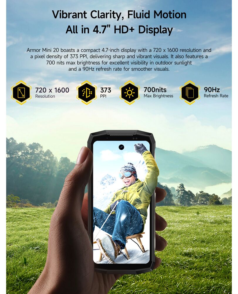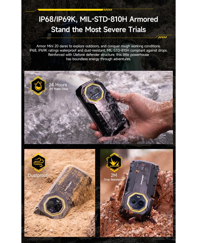 Με βολικό μέγεθος τσέπης, πιστοποίηση IP68/IP69K και πρότυπο MIL-STD-810H, το Armor Mini 20 είναι σχεδιασμένο για να αντέχει σε ακραίες συνθήκες χρήσης και περιβάλλοντα.