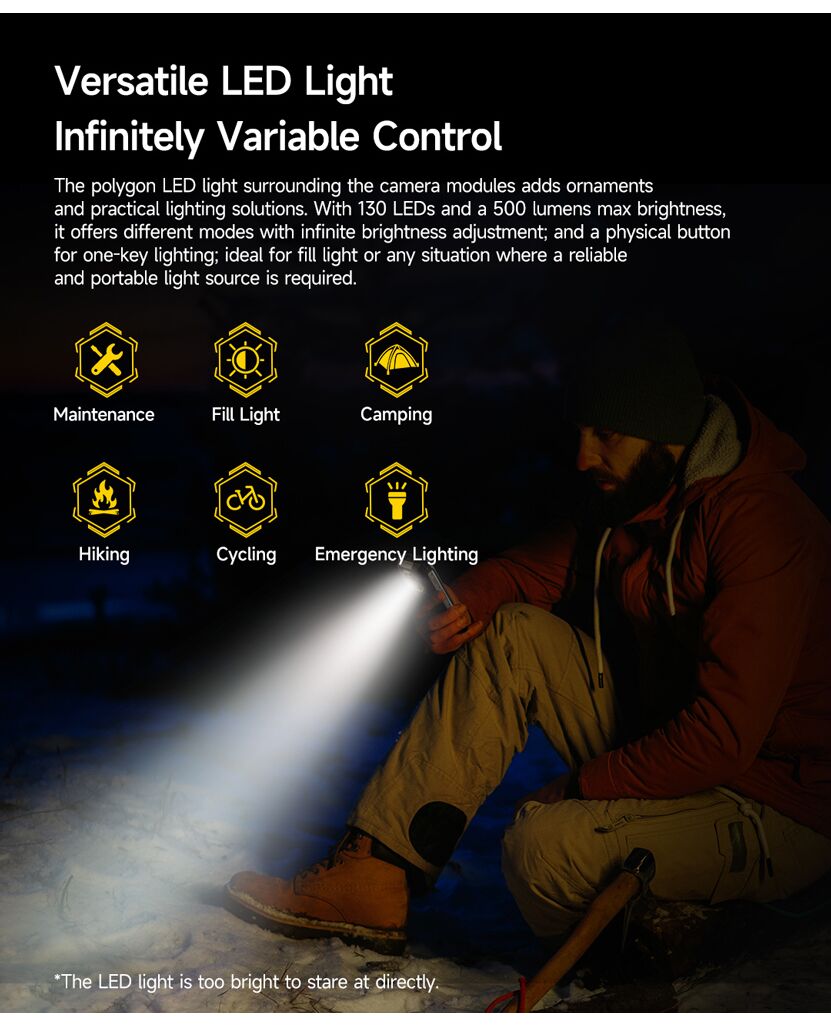 Διαθέτει φακό 5W με 500 lumens φωτεινότητα, ικανό να φωτίσει μεγαλύτερες περιοχές γρήγορα με το πάτημα ενός κουμπιού. Επιπλέον, υποστηρίζει λειτουργία φωτός έκτακτης ανάγκης με κόκκινο και μπλε φως.
