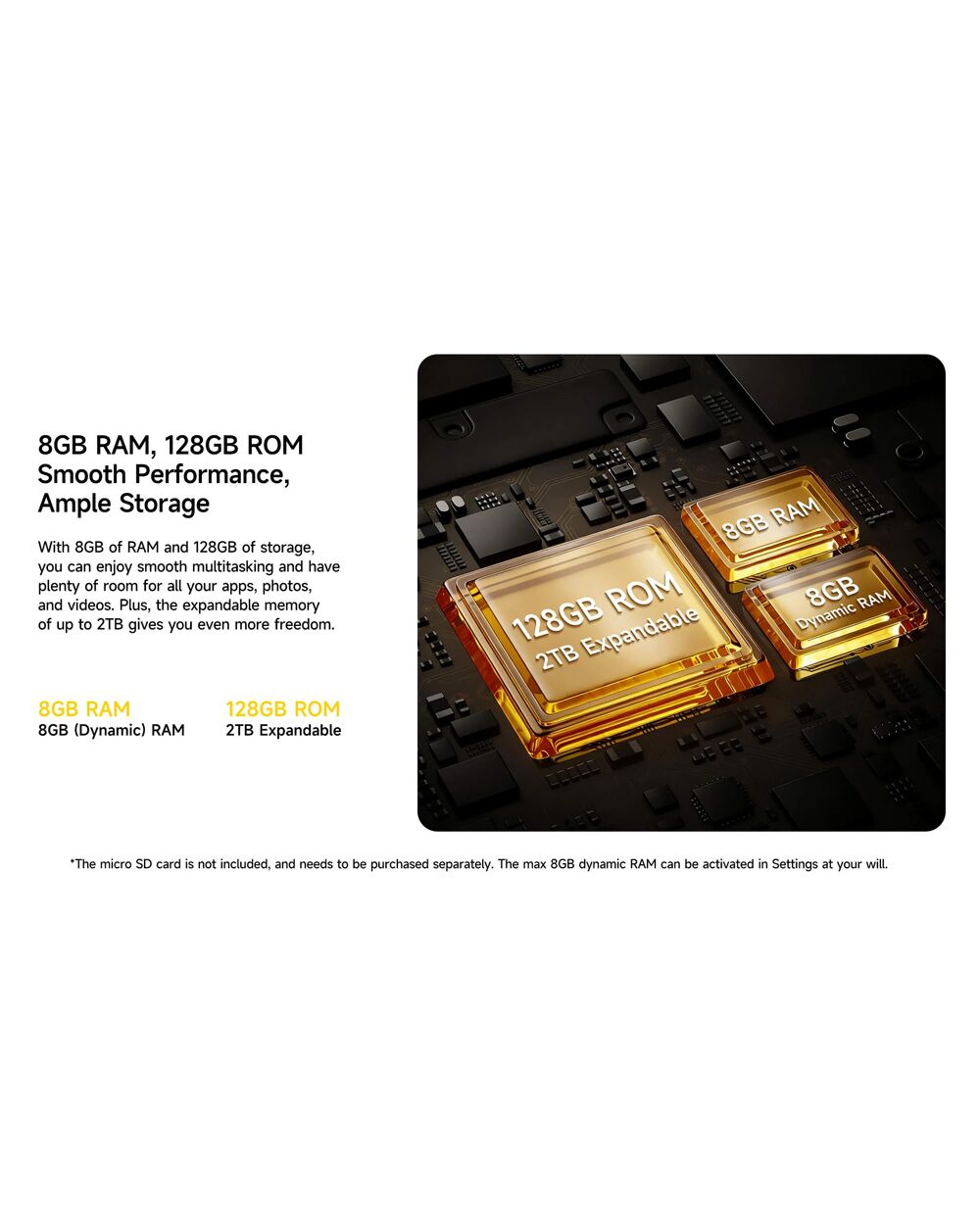 Εξοπλίζεται με μεγάλη οθόνη 6.56", οκταπύρηνο επεξεργαστή, 8GB (+8GB virtual) μνήμη RAM και 128GB αποθηκευτικό χώρο, με δυνατότητα επέκτασης έως 2TB με κάρτα μνήμης micro SD (δεν συμπεριλαμβάνεται).