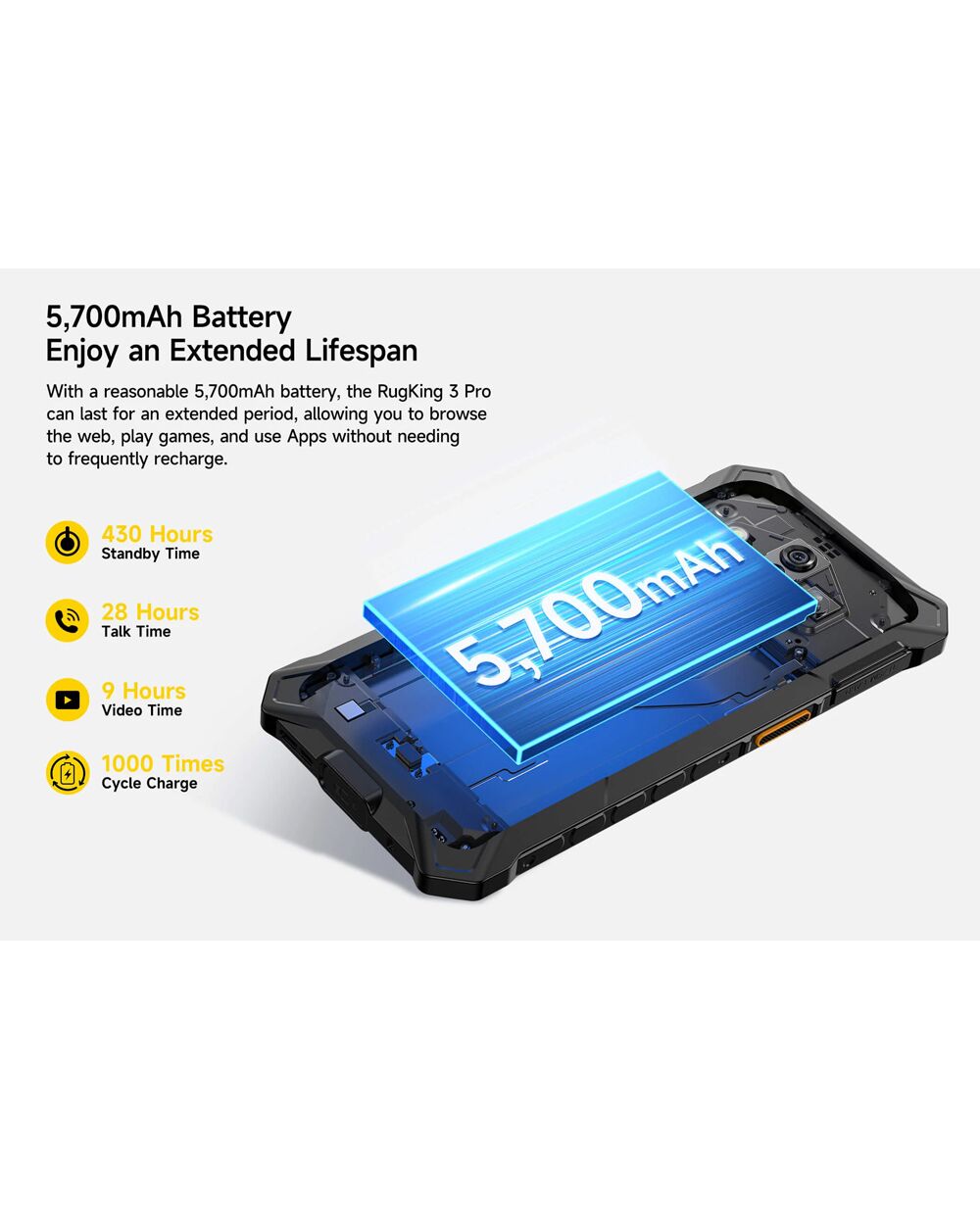 Με μπαταρία 5700mAh, το RugKing 3 Pro προσφέρει εξαιρετικά μεγάλη αυτονομία, που θα σας απαλλάξει από τις συχνές αναζητήσεις τροφοδοσίας.