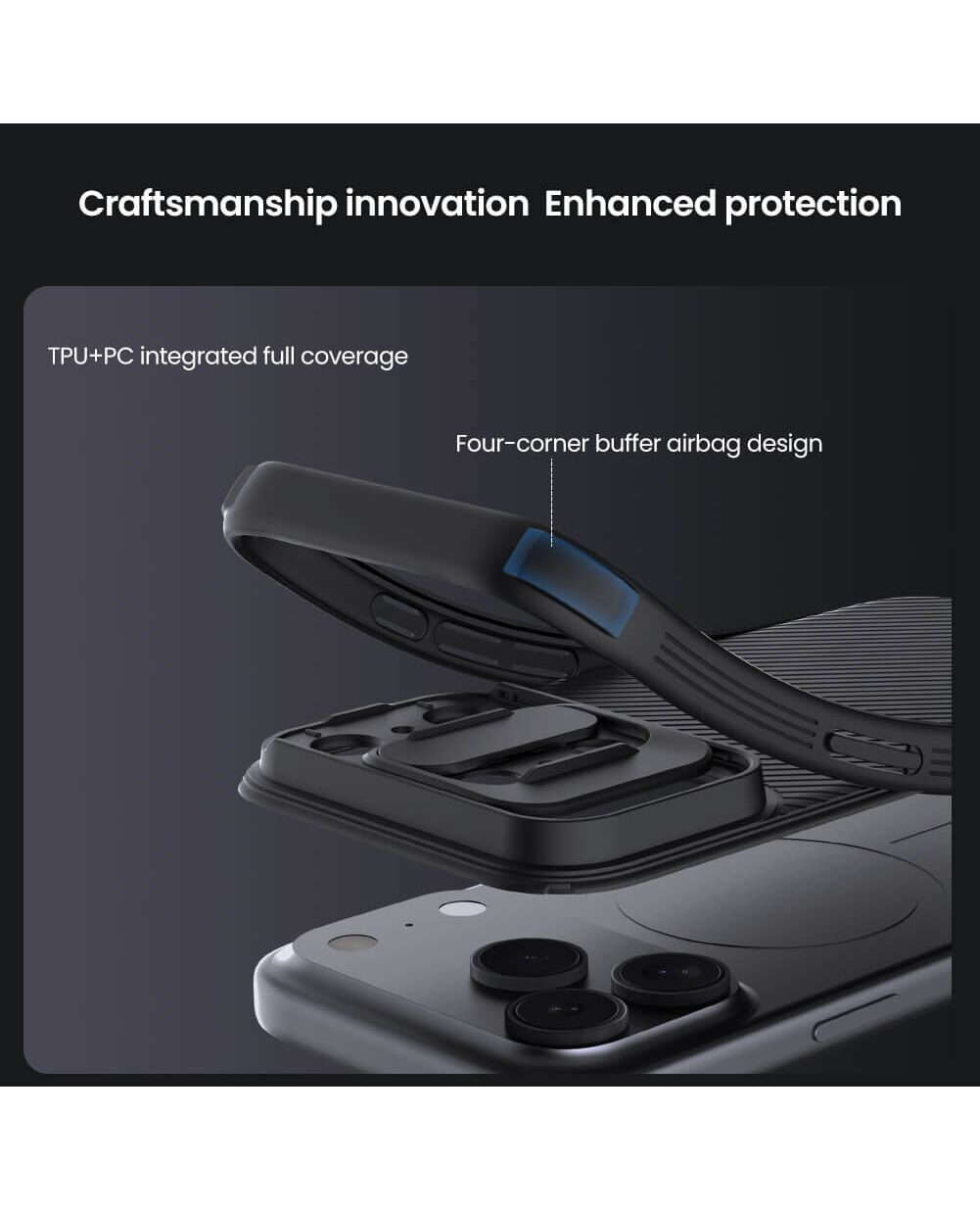 Η θήκη της σειράς CamShield Pro της Nillkin χαρακτηρίζεται από την ενισχυμένη προστασία που προσφέρει, το σκληρό υλικό κατασκευής της με την ανάγλυφη επιφάνεια, αλλά και την έξτρα προστασία των καμερών και της ιδιωτικότητας σας, χάρη στο συρόμενο καπάκι της.