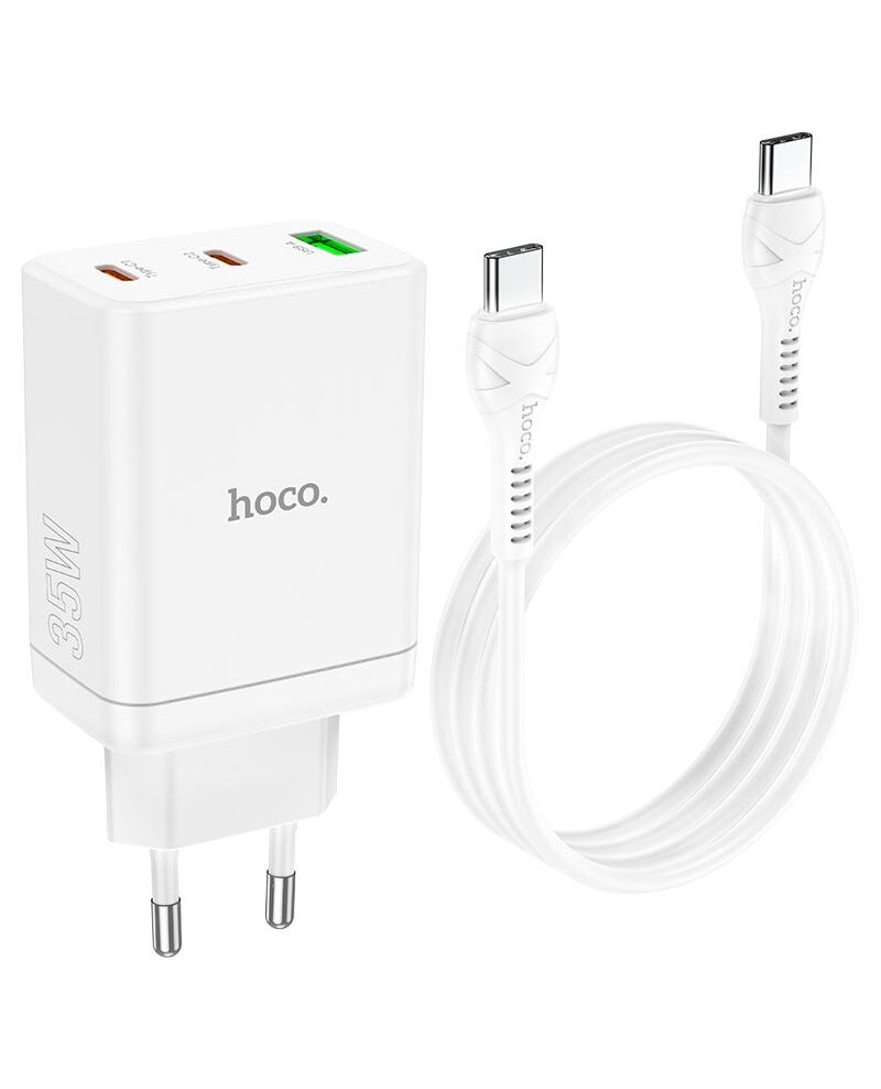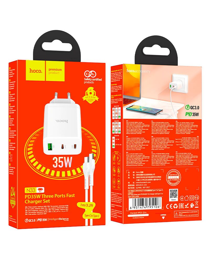 Blank pageN33 Start, dual Type-C 35W and single USB-A 22.5W ports wall charger, EU plug, sets with 1m cable Type-C to Lightning or Type-C to Type-C1. Input: AC100-240V, 50 / 60Hz, 1A.2. Output:1 ? Type-C 1 5V / 3A, 9V / 3A, 12V / 2.92A, 15V / 2.33A, 20V / 1.75A 35W max.1 ? Type-C 2 5V / 3A, 9V / 3A, 12V / 2.92A, 15V / 2.33A, 20V / 1.75A 35W max.PPS: 3.3-11V / 3A 33W max.1 ? USB-A 5V / 3A, 9V / 2A, 10V / 2.25A, 12V / 1.5A 22.5W max.Total output:Type-C 1 + Type-C 2 = 20W + 15W.Type-C 1 + USB-A = 20W + 15W.Type-C 2 + USB-A = 5V / 3A 15W max.Type-C 1 + [Type-C 2 + USB-A] = 20W + [15W].3. EU plug4. Fast charging protocol support: for PD35W / PPS / QC3.0 / FCP / AFC and other fast charging protocols.5. Material: flame retardant PC.6. Sets with 1m cable Type-C to Lightning or Type-C to Type-C.7. Sizes: 97 ? 47 ? 31mm.8. Weight: single charger weight 101g, set with cable weight 125g.