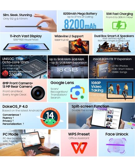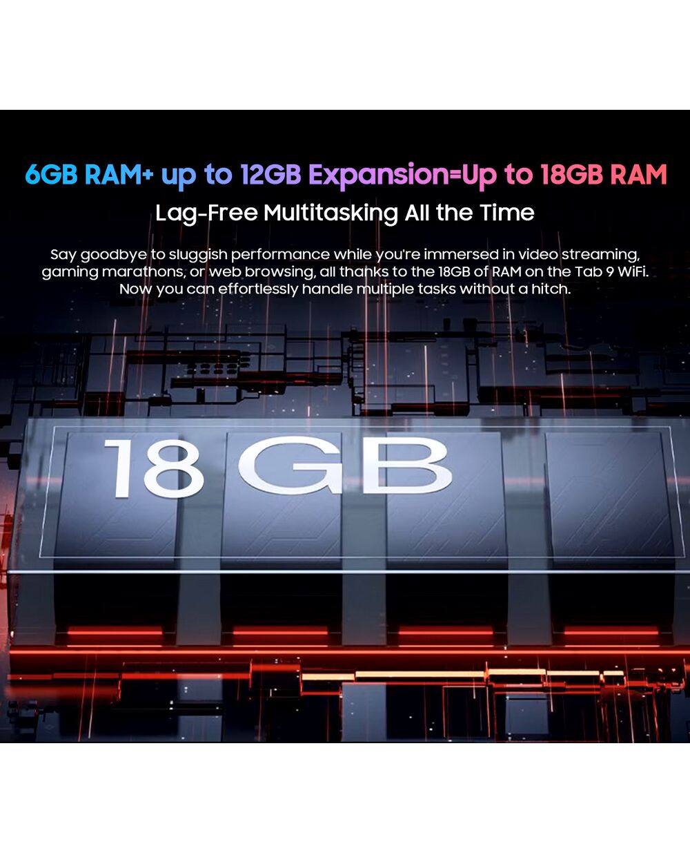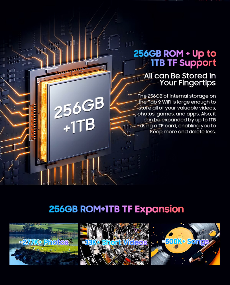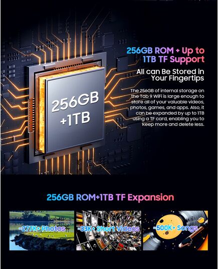 Με 6GB (+12GB virtual) RAM και 256GB ROM για να αποθηκεύετε τα αγαπημένα σας αρχεία, φωτογραφίες και βίντεο. Επιπλέον, προσφέρει την δυνατότητα να επεκτείνετε τον χώρο αποθήκευσης του tablet με κάρτα micro SD έως 1TB.