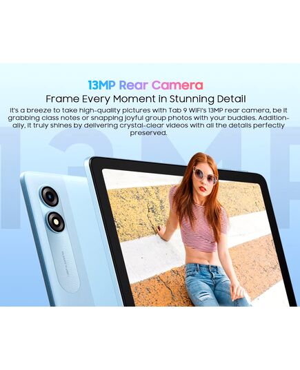 Το Tab 9 WiFi σας επιτρέπει να να πραγματοποιείται ταυτόχρονες δραστηριότητες με τη λειτουργία split screen και να αποτυπώνετε κάθε στιγμή με την κύρια κάμερα 13MP και την εμπρόσθια selfie κάμερα 8MP.