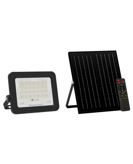 LED ηλιακός προβολέας εξωτερικού χώρου της Powertech με ισχύ 30W. Διαθέτει πλαστικό περίβλημα με στεγανοποίηση επιπέδου IP66.
