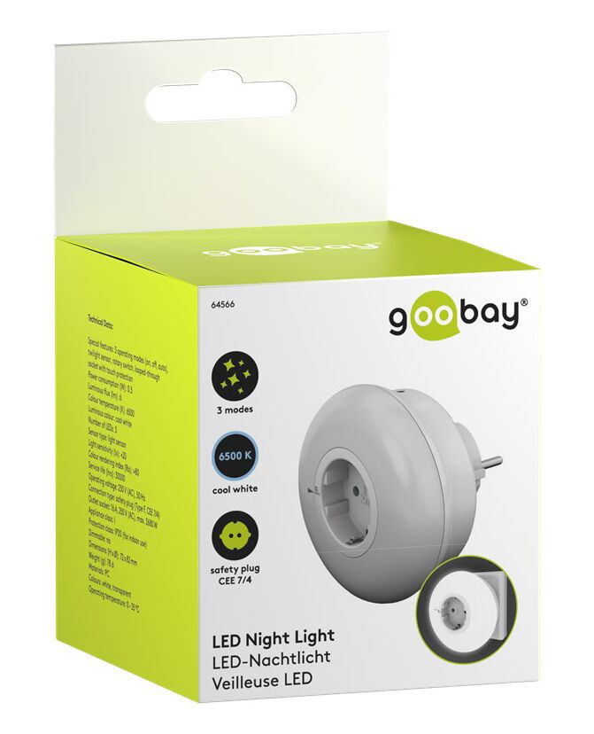 Φωτιστικό νυκτός LED της Goobay με passthrough πρίζα schuko για την αξιοποίηση της πρίζας του σπιτιού. Εξοπλίζεται με αισθητήρα φωτός για την αυτόματη ενεργοποίηση του φωτιστικού όταν η φωτεινότητα φτάσει σε επίπεδο κάτω από 21 lx.