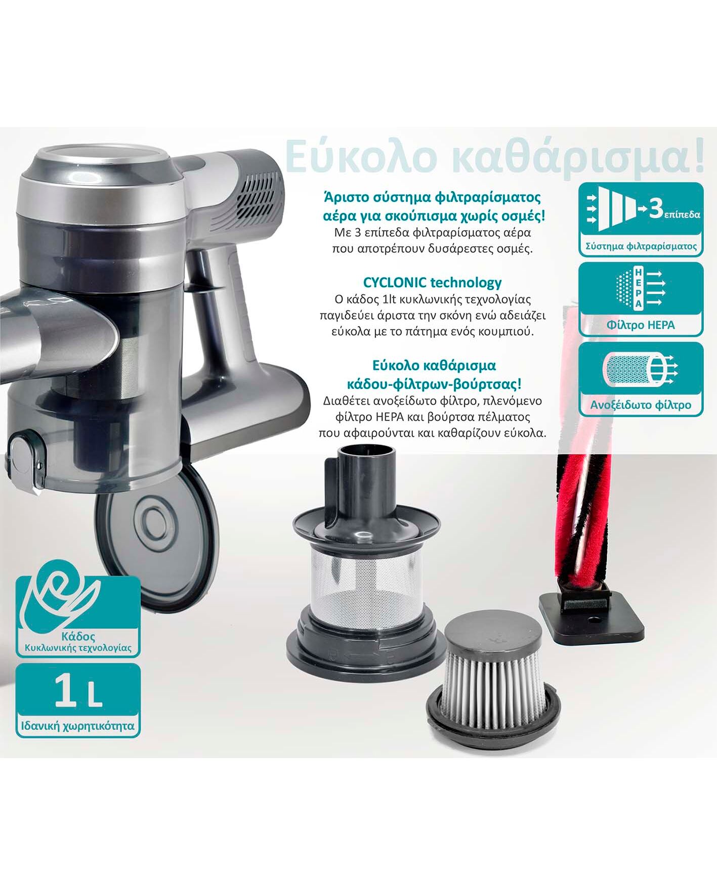 Με 3 επίπεδα φιλτραρίσματος αέρα που αποτρέπουν δυσάρεστες οσμές. Διαθέτει αποσπώμενο ανοξείδωτο φίλτρο, πλενόμενο φίλτρο HEPA και αποσπώμενη βούρτσα πέλματος που αφαιρούνται και καθαρίζουν εύκολα.