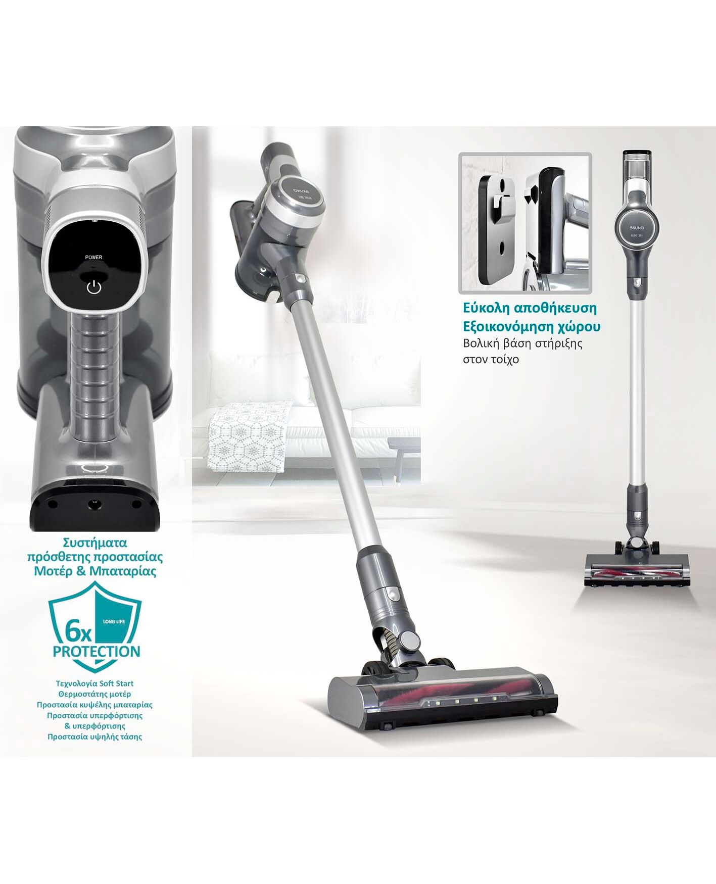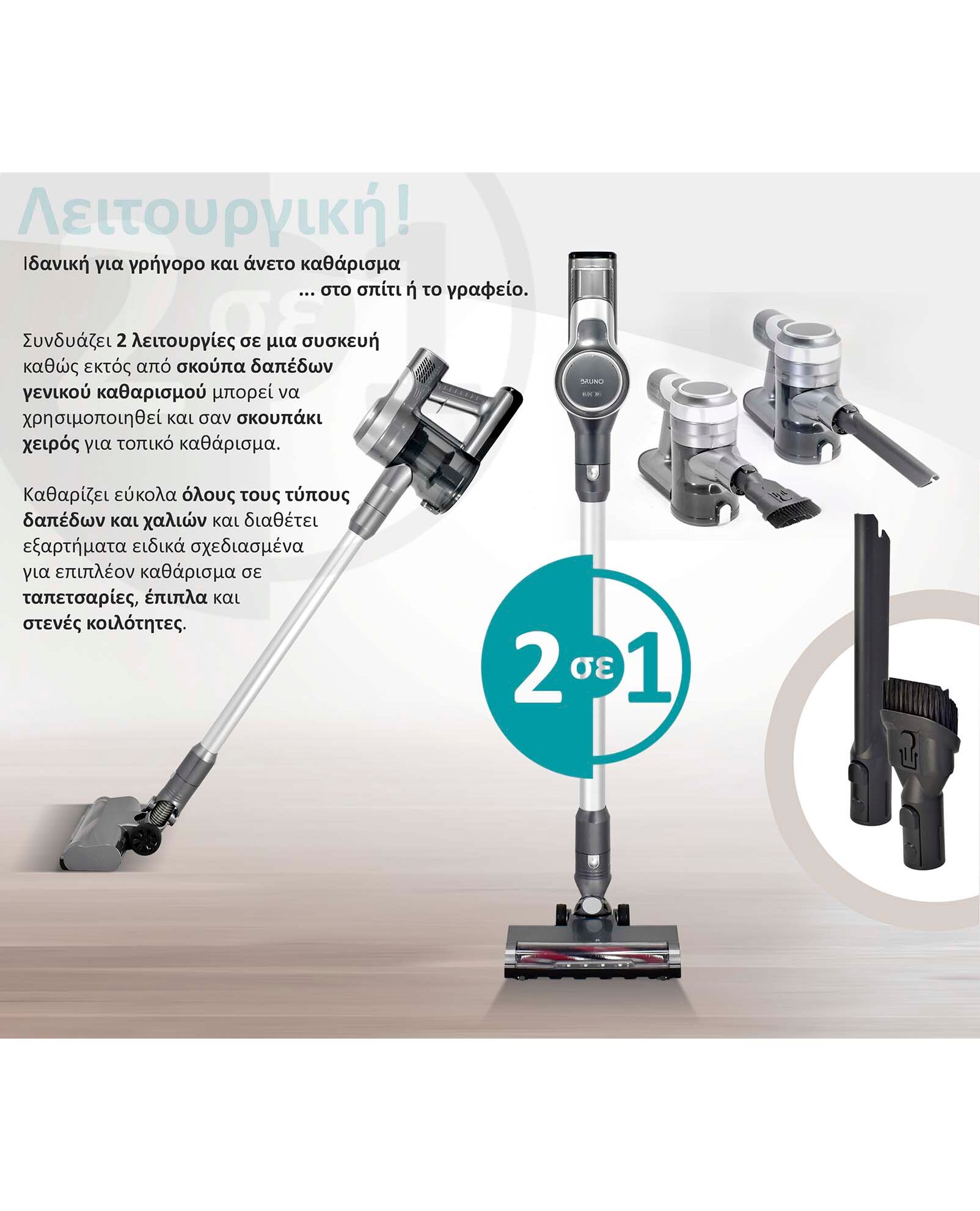 -Βασικές λειτουργίες: 2 σε 1. Καθάρισμα δαπέδων, χαλιών, επίπλων κτλ. Επιπλέον μπορεί να χρησιμοποιηθεί και σαν σκουπάκι χειρός.