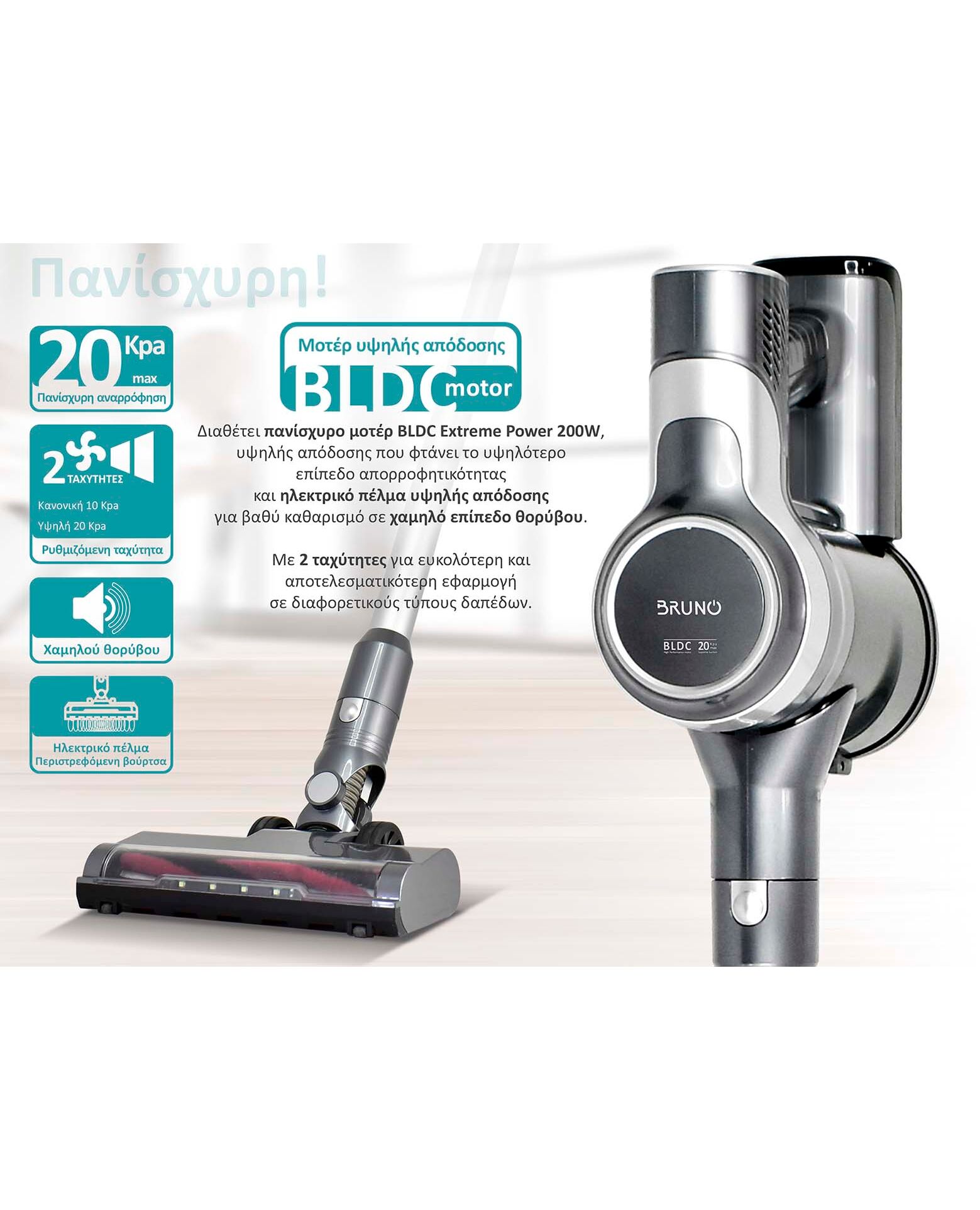 Διαθέτει πανίσχυρο μοτέρ BLDC Extreme Power 200W, υψηλής απόδοσης που φτάνει το υψηλότερο επίπεδο απορροφητικότητας 20Kpa και πέλμα υψηλής απόδοσης για βαθύ καθαρισμό σε χαμηλό επίπεδο θορύβου.