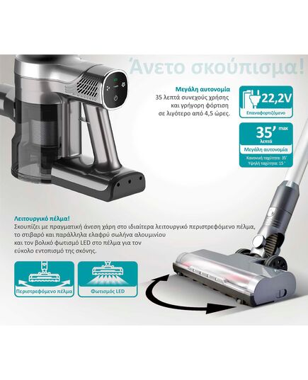 Συνδυάζει 2 λειτουργίες σε μια συσκευή καθώς μπορεί να χρησιμοποιηθεί σαν σκούπα δαπέδων γενικού καθαρισμού αλλά και σαν σκουπάκι χειρός για τοπικό καθάρισμα.