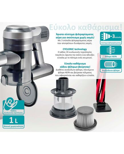Ο κάδος 1lt κυκλωνικής τεχνολογίας παγιδεύει άριστα την σκόνη ενώ αδειάζει εύκολα με το πάτημα ενός κουμπιού.