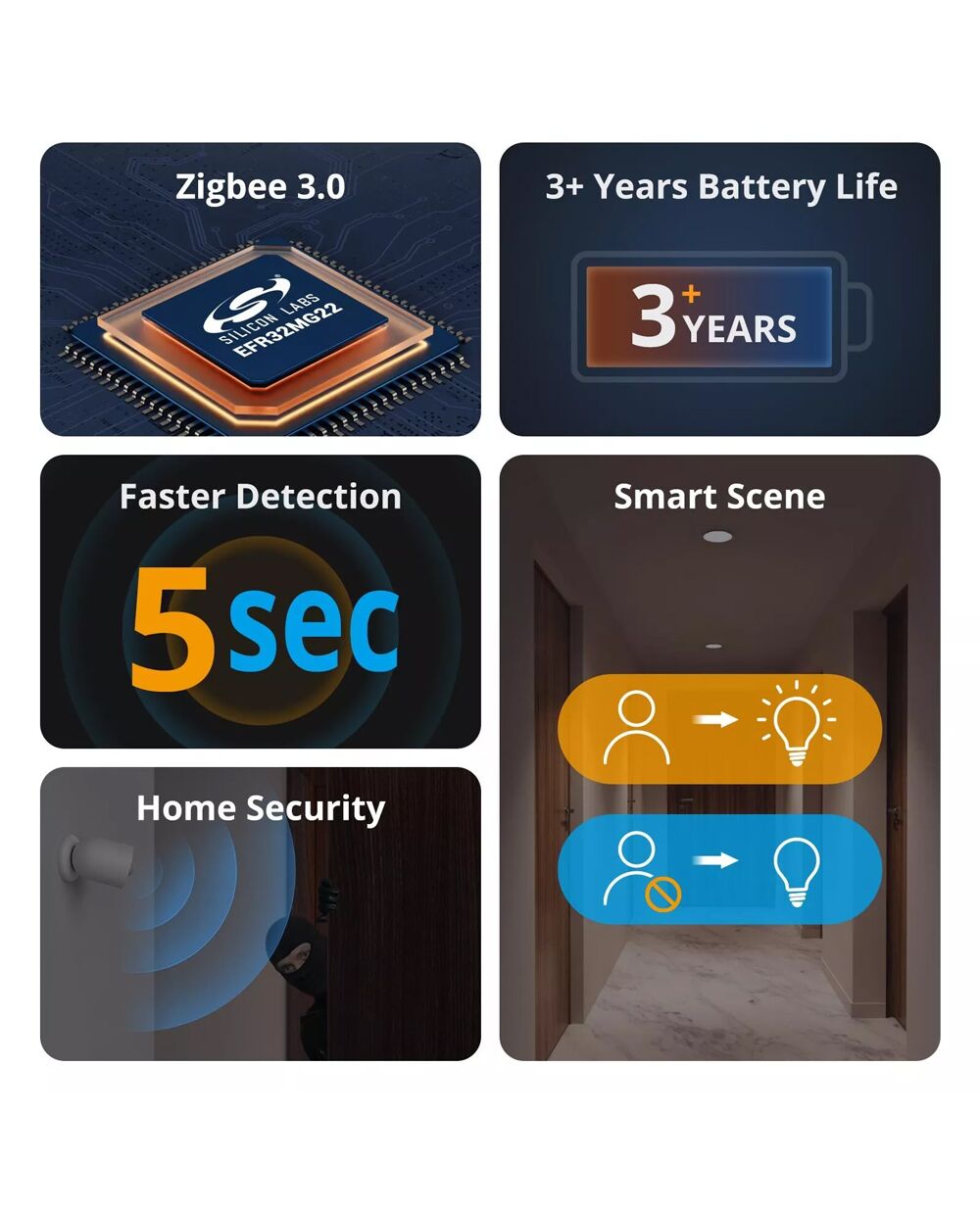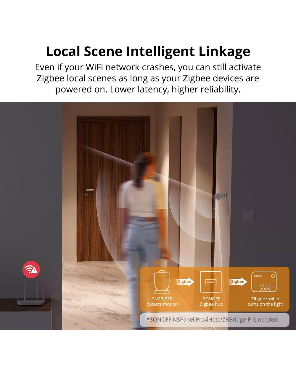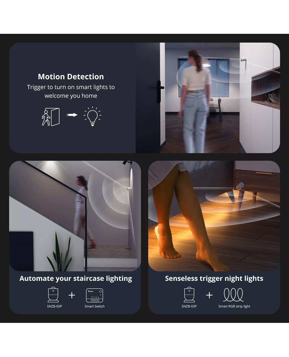 Με τον ανιχνευτή κίνησης SNZB-03P μπορείτε να δημιουργήσετε smart σκηνές, όπως για παράδειγμα το αυτόματο άνοιγμα του φωτισμού, όταν ανιχνεύεται κίνηση. Επιπλέον, όταν απουσιάζεται από το σπίτι, σε περίπτωση ανίχνευσης κίνησης, ενεργοποιεί τον συναγερμό στο κεντρικό πάνελ και την καταγραφή μέσω κάμερας, ενώ παράλληλα, στέλνει ειδοποίηση στο smartphone σας μέσω της εφαρμογής eWeLink.