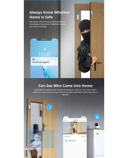 Ο σένσορας DW2-RF της Sonoff τοποθετείται σε πόρτες ή παράθυρα και στέλνει άμεσα ειδοποίηση στο κινητό, σε περίπτωση παραβίασης. Επίσης, προσφέρει την δυνατότητα συνεργασίας με κάμερα ασφαλείας ή ακόμη και ένα παλιό smartphone για την αποστολή εικόνας, ώστε να γνωρίζετε ποιος έχει μπει στον χώρο. Κρατάει ιστορικό 3 μηνών και είναι συμβατός με το app eWeLink. Επίσης μπορεί να συνδεθεί και με τον φωτισμό του χώρου αλλά και με ακόμη περισσότερες συσκευές, εάν συνδυαστεί με IFTTT service.