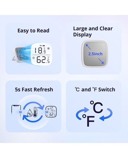 Δημιουργήστε ένα άνετο περιβάλλον για τους αγαπημένους σας. Η έξυπνη αυτή συσκευή ανιχνεύει και καταγράφει τη θερμοκρασία και την υγρασία σε πραγματικό χρόνο. Εξοπλίζεται με μεγάλη ευανάγνωστη οθόνη και προσφέρει ακριβή δεδομένα θερμοκρασίας και υγρασίας, χάρη στον βιομηχανικού επιπέδου αισθητήρα κατασκευής, με εξαιρετική ακρίβεια. Λιτή κατασκευή, με μπαταρία CR2450 και ένδειξη χαμηλής μπαταρίας.