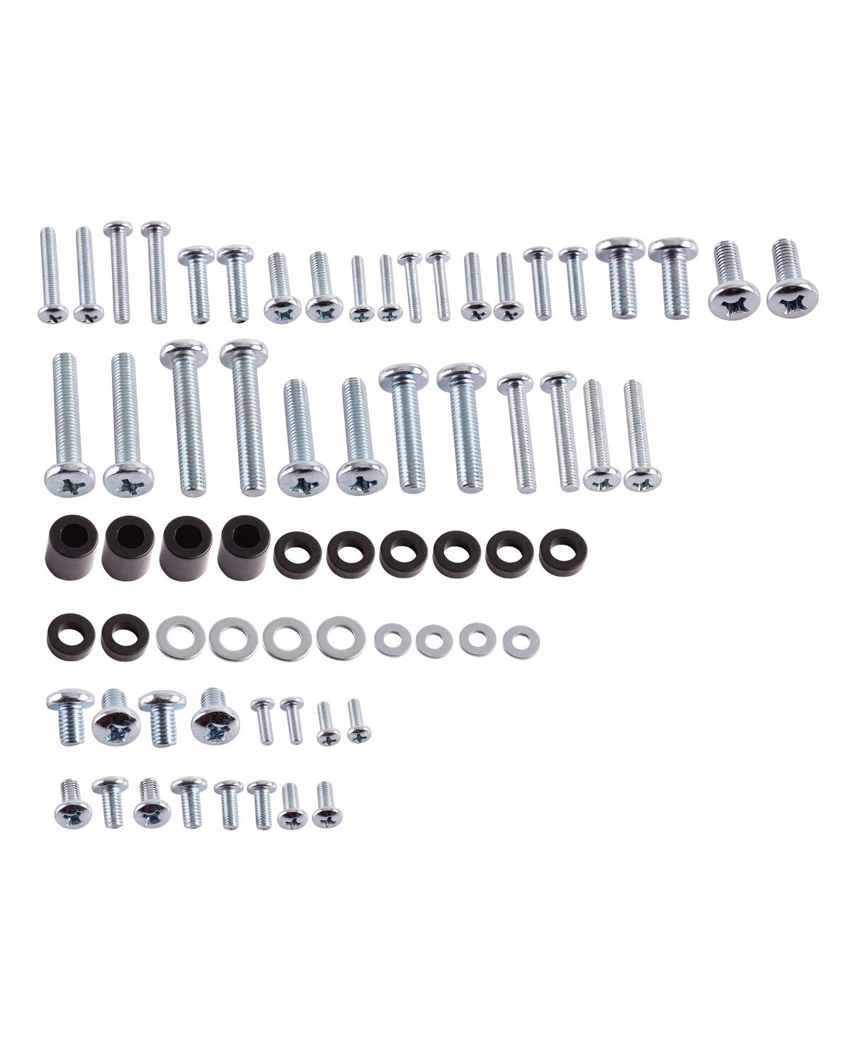 Κιτ βιδών με ροδέλες και αποστάτες σε διάφορα μεγέθη, ιδανικά για την εγκατάσταση τηλεόρασης σε βάση.