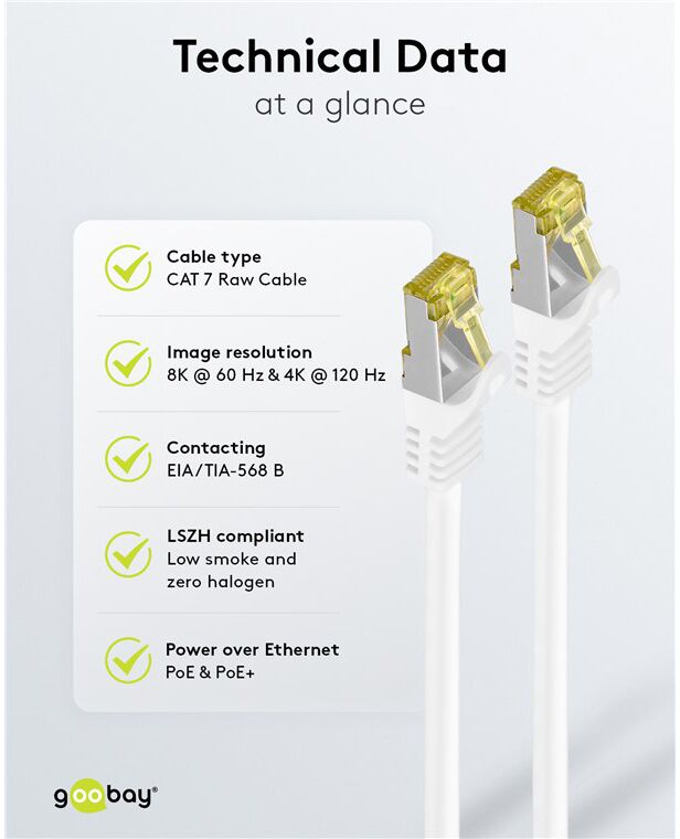 Τα καλώδια δικτύου της Goobay κατασκευάζονται από ποιοτικά υλικά, με τις υψηλότερες τεχνικές προδιαγραφές, προσφέροντας αξιόπιστη λειτουργία υψηλής απόδοσης, με αντοχή στον χρόνο.