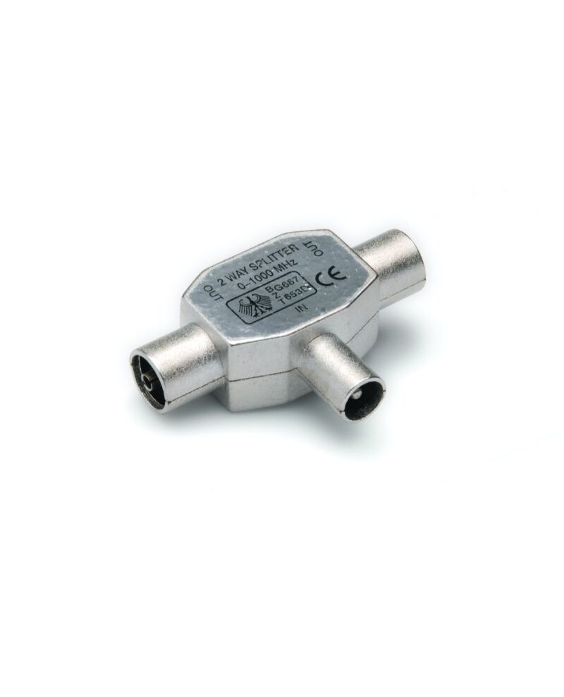 G&BL Antenna 2 way splitter, 1 x coax plug IEC 9,5mm - 2 x coax socket IEC 9,5mm, Metal