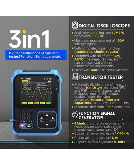 Το DSO-TC3 είναι ένα εξαιρετικά πρακτικό ψηφιακό εργαλείο 3 σε 1 που συνδυάζει τις λειτουργίες ενός παλμογράφου, ενός signal generator και ενός transistor tester.