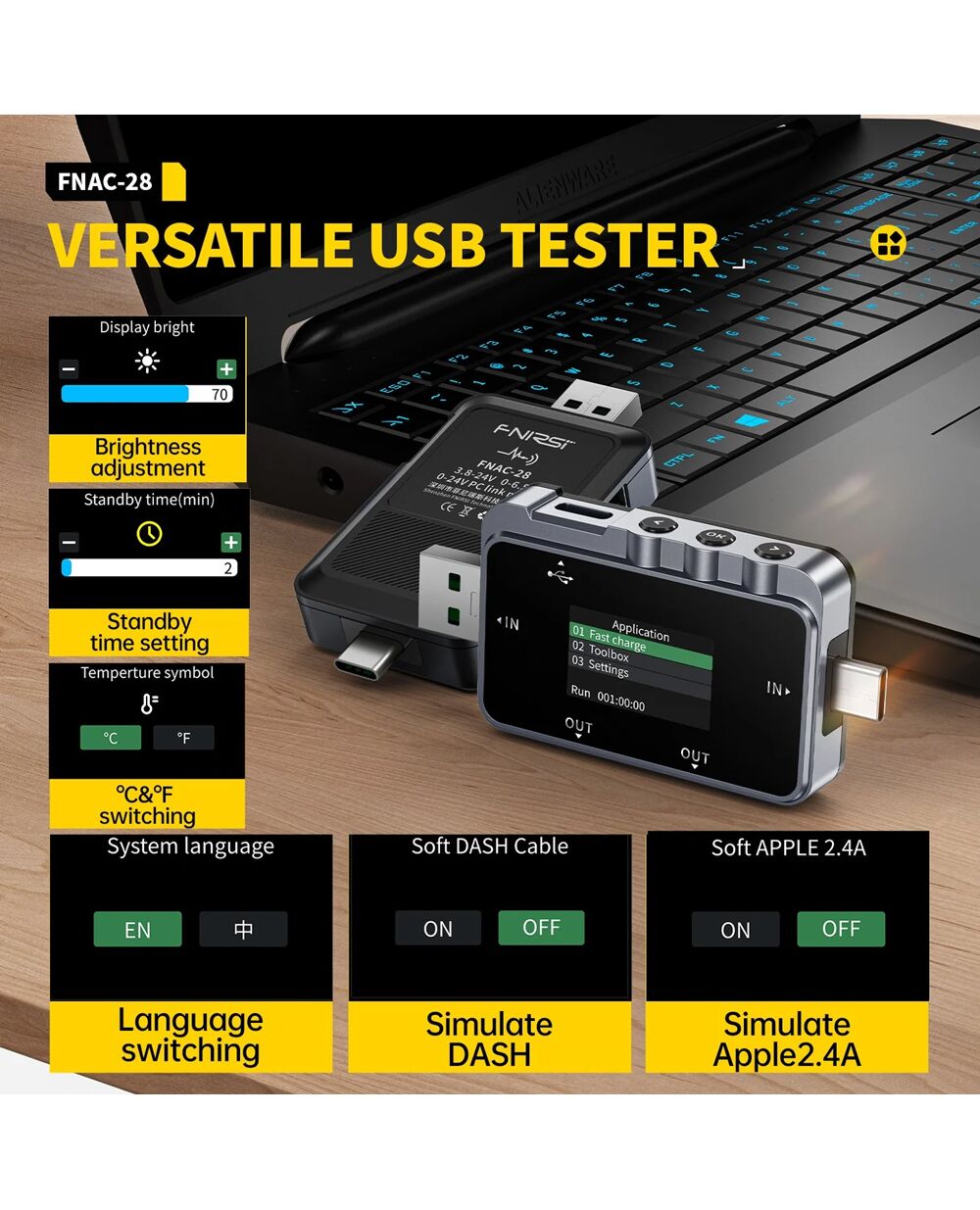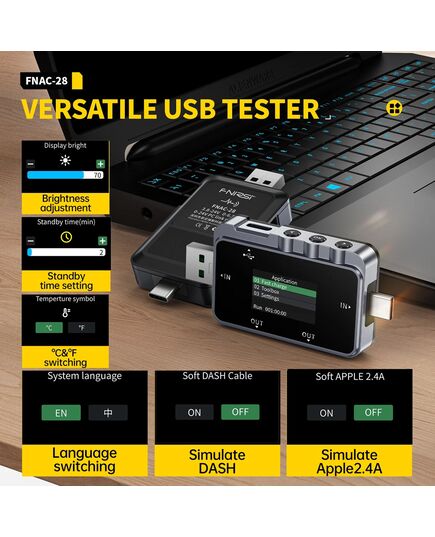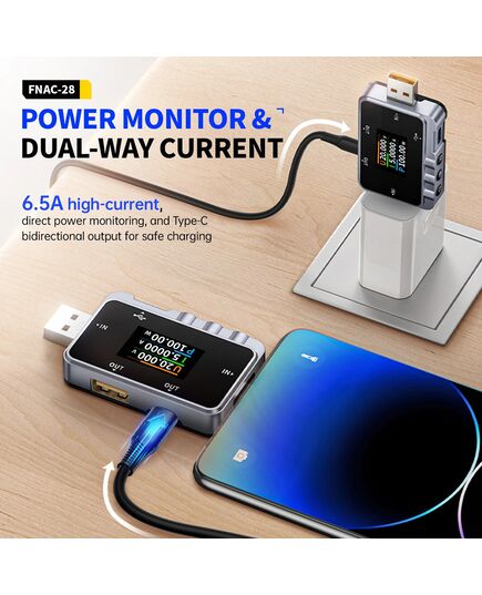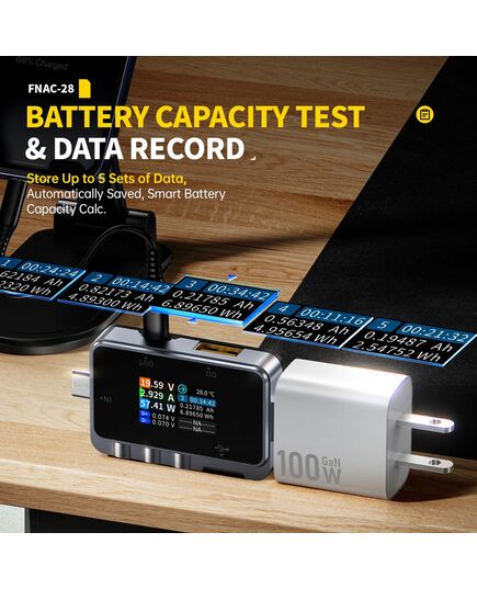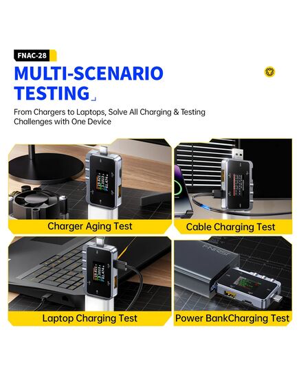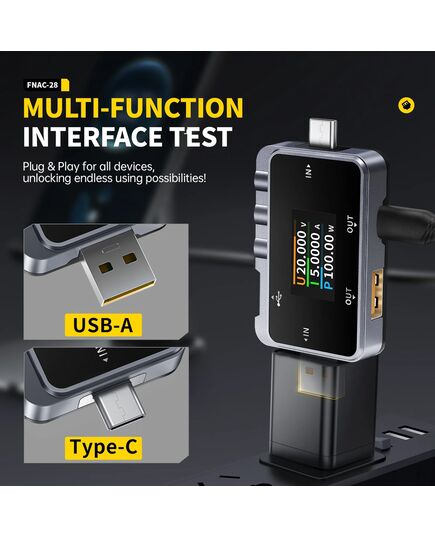 Το FNAC-28 είναι ένα USB tester το οποίο μπορεί να επαληθεύσει τις δυνατότητες γρήγορης φόρτισης σε φορτιστές, και να παρακολουθήσει σε πραγματικό χρόνο την κατάσταση φόρτισης με την ακριβή τάση, ρεύμα και ισχύ.