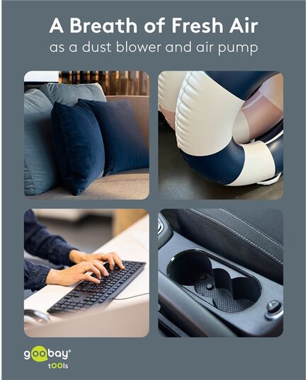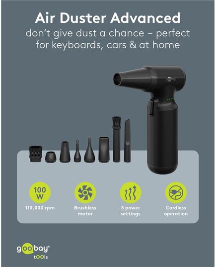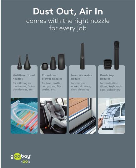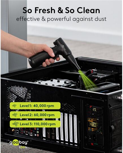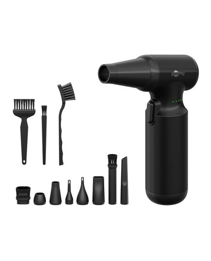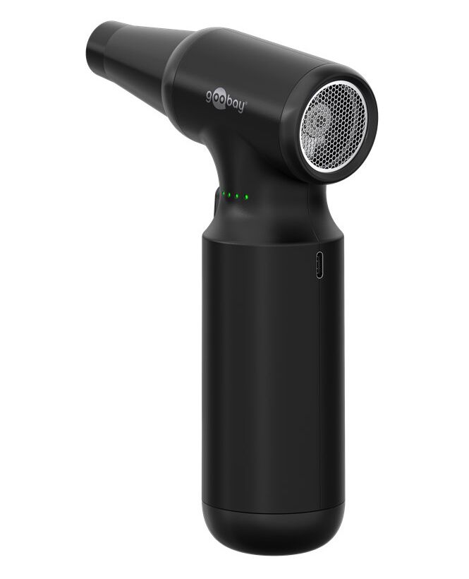 Ηλεκτρικό air duster της Goobay, κατάλληλο για την απομάκρυνση της σκόνης από αξεσουάρ και οικιακά αντικείμενα όπως πληκτρολόγια, PC cases, κλιματιστικά, ηλεκτρονικές συσκευές κ.α.