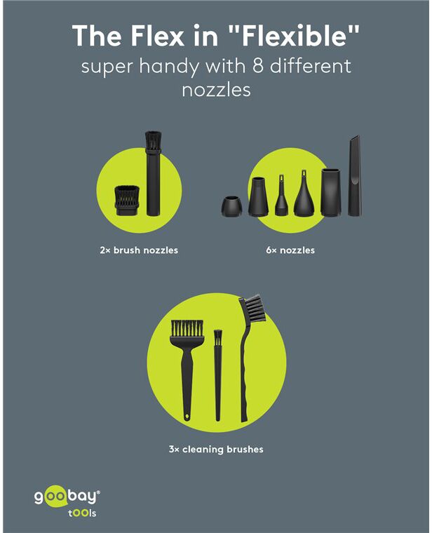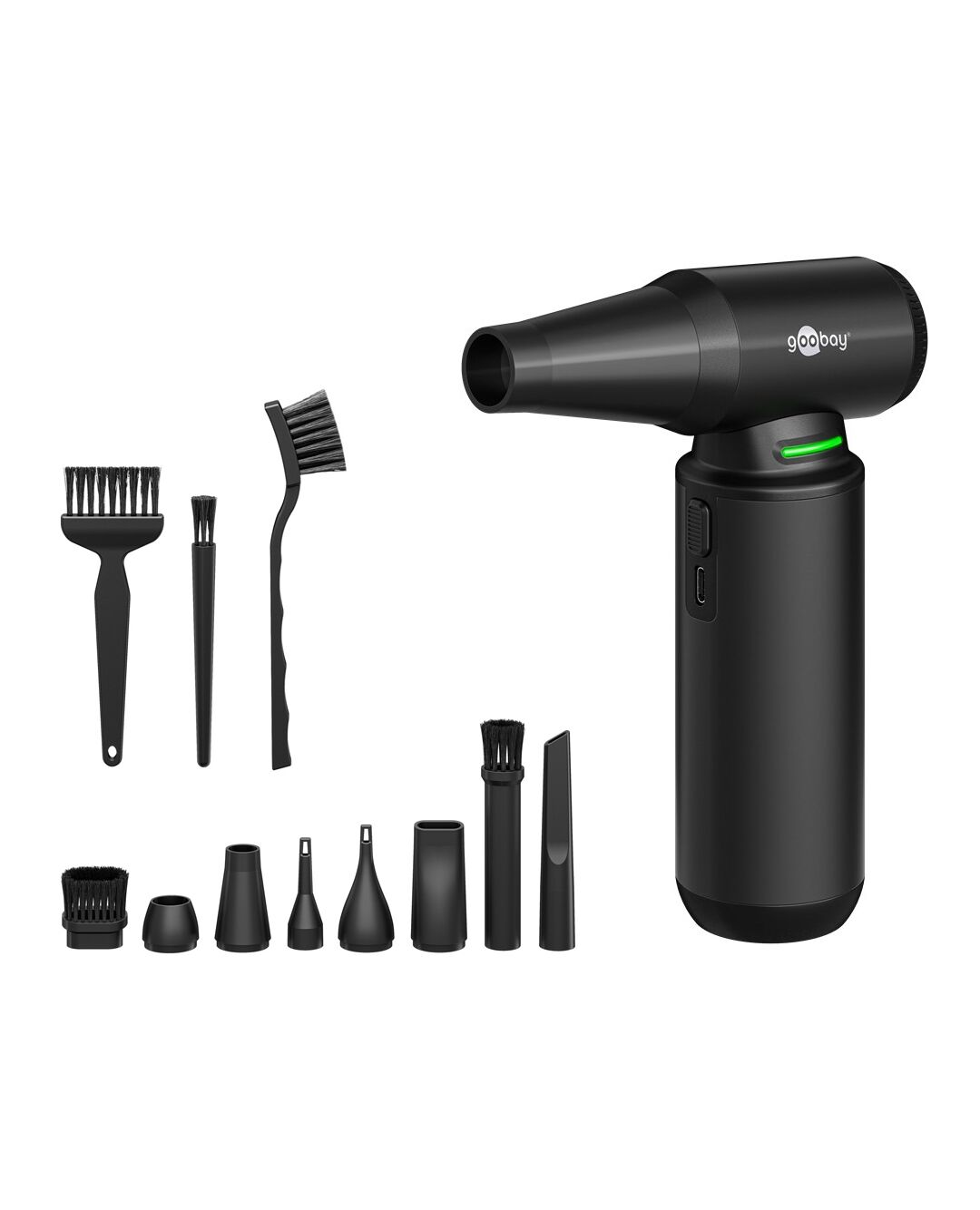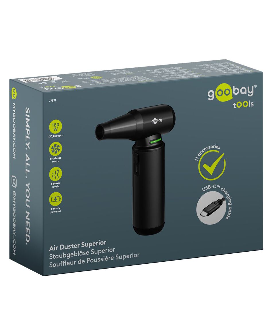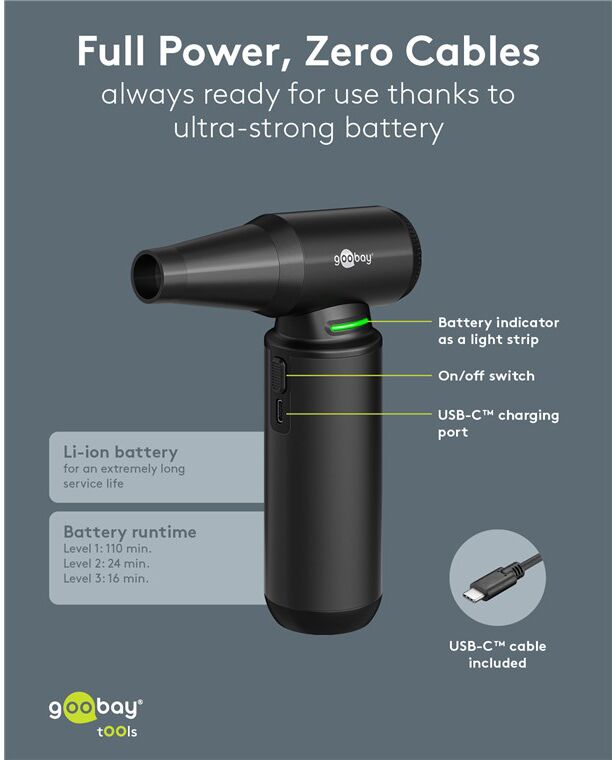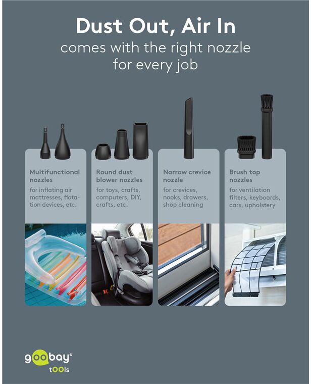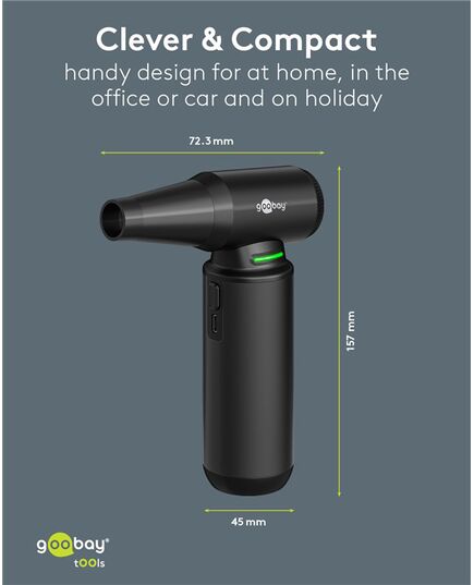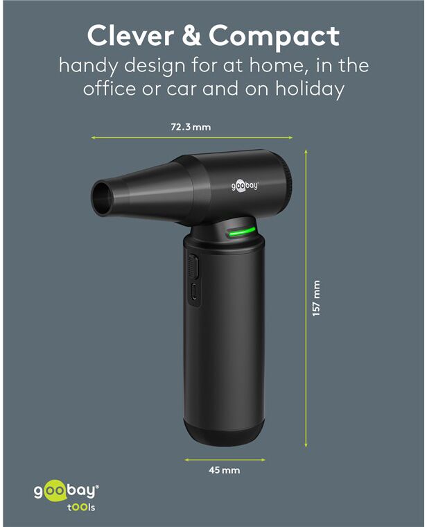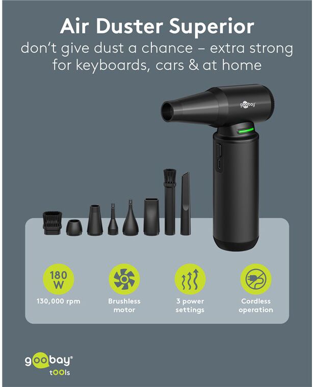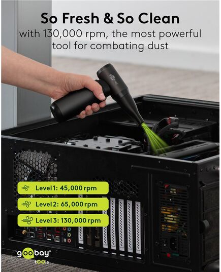 Ηλεκτρικό air duster της Goobay, κατάλληλο για την απομάκρυνση της σκόνης από αξεσουάρ και οικιακά αντικείμενα όπως πληκτρολόγια, PC cases, κλιματιστικά, ηλεκτρονικές συσκευές κ.α.