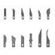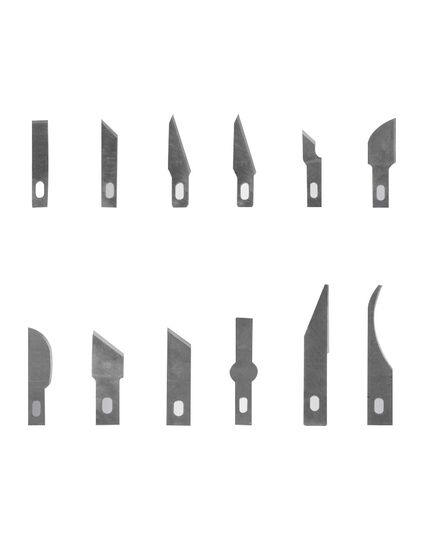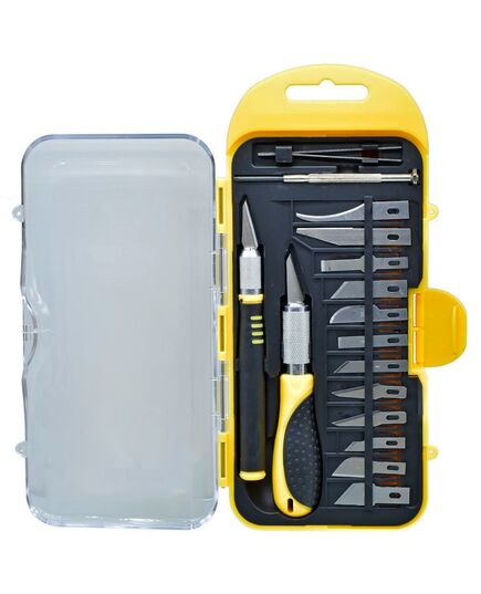 Το σετ περιλαμβάνει 2x κοπίδια, 12x λεπίδες σε διάφορα σχήματα, τσιμπίδα και κατσαβίδι ίσιο.