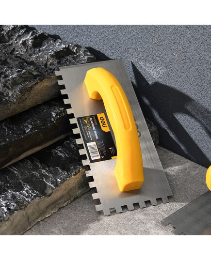 Σπάτουλα πλακιδίων της DELI με ανθεκτική λάμα από χάλυβα άνθρακα και πλαστική λαβή. Είναι ιδανική για εργασίες σοβατίσματος και ομοιόμορφη εφαρμογή κόλλας πλακιδίων σε δάπεδα και τοίχους.