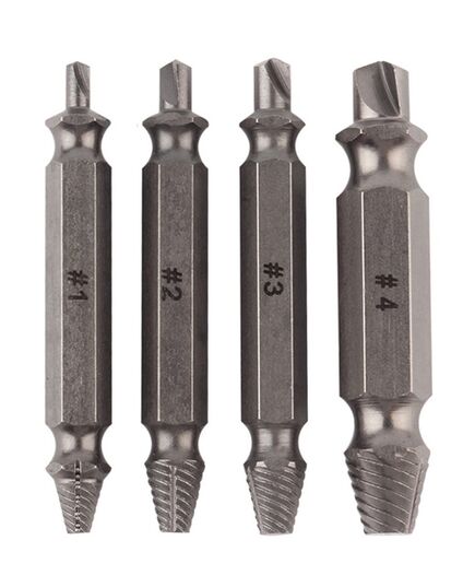 Εξαιρετικό σετ, που αποτελείται από 4 ατσάλινους εξολκείς βιδών σε διαφορετικά μεγέθη. Εφαρμόζουν σε τρυπάνι και σας επιτρέπουν να αφαιρέσετε εύκολα κατεστραμμένες ή κολλημένες βίδες των πιο δημοφιλών μεγεθών.